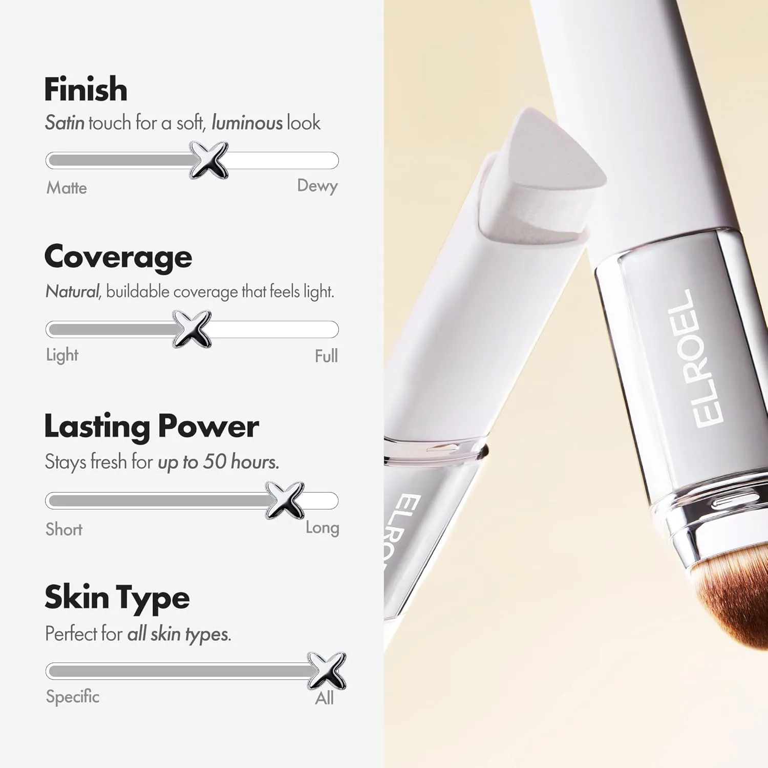 در یک‌طرف کرم پودر ابریشمی و در سمت دیگر براش آلمانی با ۳۲,۰۰۰ تار موی ظریف PBT که به‌صورت یکنواخت، پوشش را روی پوست پخش می‌کند. برس کاملاً قابل جدا شدن و شستشو است — بهداشت و تمیزی در کنار راحتی مطلق 🌸